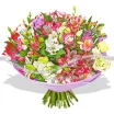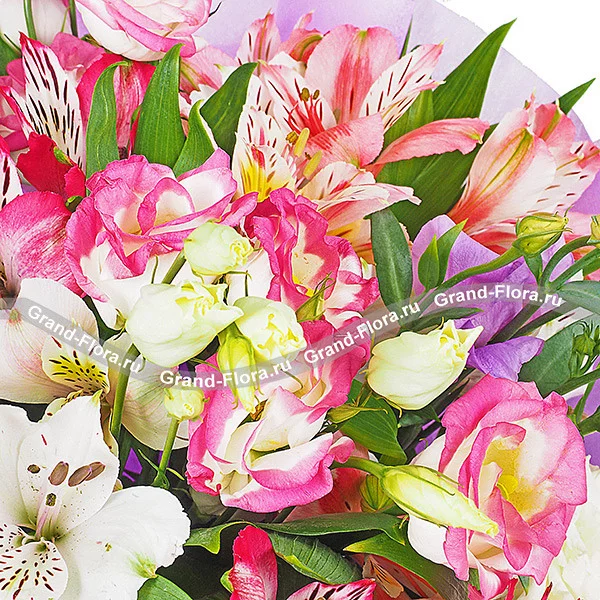 ЛЮКС: эустома розовая - 4 шт., эустома фиолетовая - 4 шт., эустома белая - 4 шт., альстромерия розовая - 8 шт., альстромерия белая - 4 шт., фетр светло-фиолетовый. Примерный диаметр букета 40х40 см.