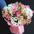 Светлый букет, собранный из ромашковых кустовых хризантем, розовых альстромерий и роз, наверняка пленит получателя своей наивной простотой, но в то же время и очаровательной красотой. Деликатное сочетание цветов, подчеркнутое оберткой из фетра и декоративным бантом, станет великолепным выбором для вручения маме или бабушке в памятный день.