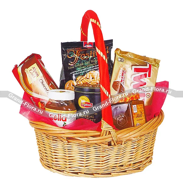 Стандартный:печенье "Festival" - 1 шт., шоколад "Twix" - 1 уп., мед - 1 шт., печенье "Alpen Gold Chocolife" - 1 шт., шоколадная паста "Nutella" - 1 шт., чай "Lipton" - 1 шт., корзина средняя, декор.