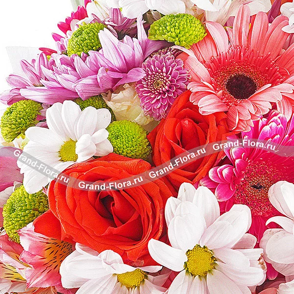 Стандартный (на фото): роза розовая - 3 шт, роза белая - 3 шт, роза красная - 5 шт, гербера розовая - 2 шт, гербера малиновая - 3 шт, хризантема кустовая (белая и розовая) - 5 шт, хризантема кустовая зеленая - 2 шт, хризантема одноголовая белая - 2 шт, альстромерия (белая и розовая) - 2 шт, статица - 1 шт, фетр фиолетовый, мишка до 20 см.