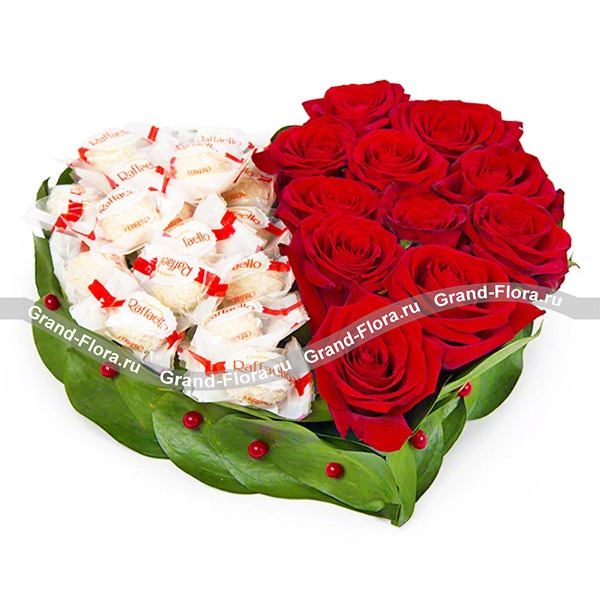 Стандартный (на фото): роза красная - 11 шт., рускус, конфеты Raffaello, оазис. Примерный размер: 25Х25 см.