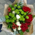 Уменьшенный: роза красная - 2 шт., роза кустовая белая - 1шт., хризантема кустовая зелёная - 1 шт., аспидистра - 1 шт., эвкалипт - 1 шт., салал - 2 шт., гиперикум - 1 шт., упаковка крафт, лента. Примерный размер: 20Х20 см.