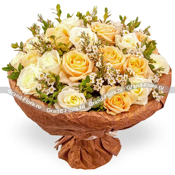 Стандартный: роза белая - 9 шт., роза кремовая - 8 шт., декоративная зелень, упаковка, лента. Примерный размер: 25Х25 см.