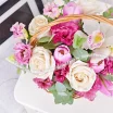 роза белая - 4 шт., тюльпан розовый - 5 шт. (замена на альстромерию или розу), эустома розовая - 5 шт., орхидея белая - 1 шт., эвкалипт, оазис, корзина.
