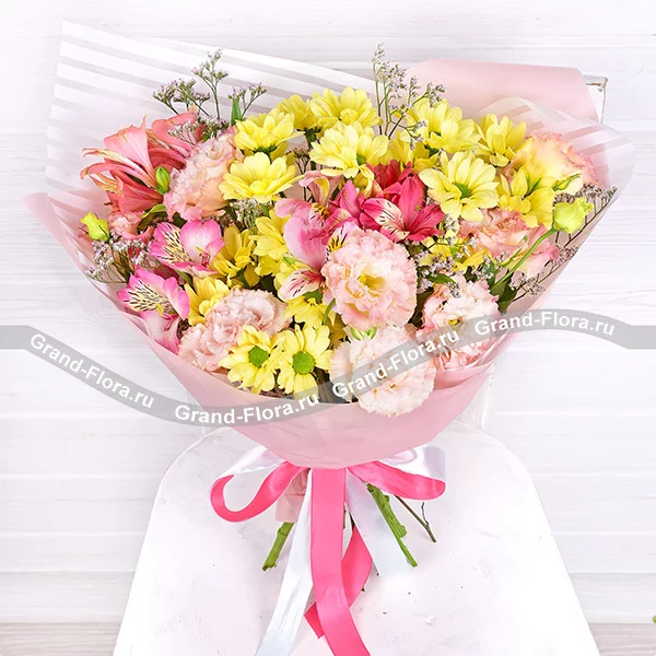 Хризантема желтая – 5шт., эустома розовая – 5шт., альстромерия розовая –5 шт., лимониум светло-сиреневый –3 шт., упаковка, лента.